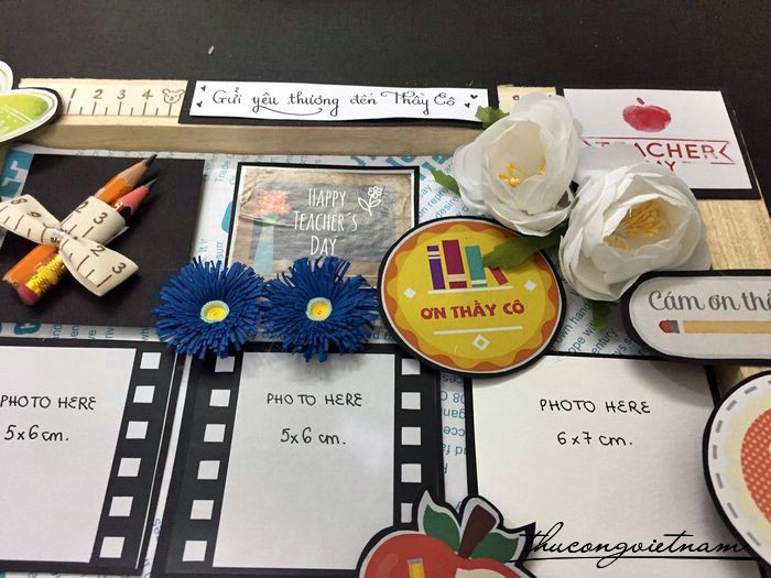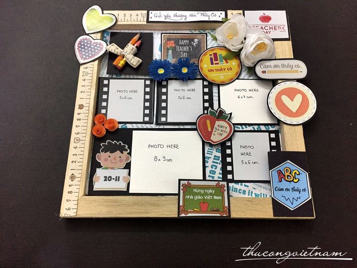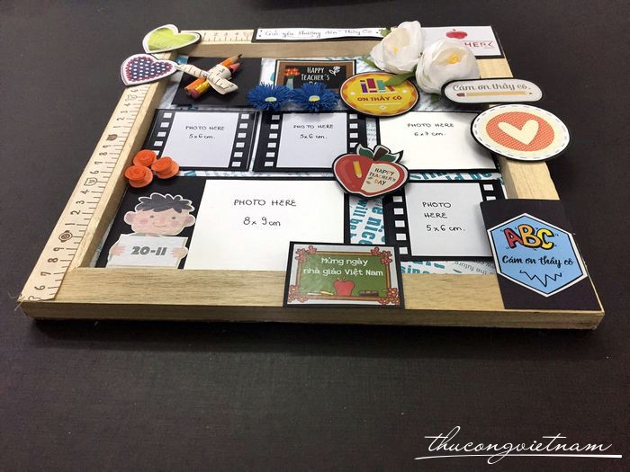 5 khung với kích thước 3 khung 5*6cm, 6*7cm, 8*9cm, ngập tràn trái tim và hoa, thể hiện tình cảm, lời cảm ơn đến thầy cô.