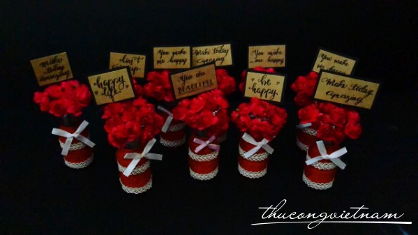 Hoa hồng giấy thái, những bông hoa nhỏ xinh cắm trong chiếc lọ thủy tinh quấn giấy bên ngoài, điểm thêm nơ ruy băng, dây ren. Thêm chút thông điệp tên tag giấy cắm vào lọ, truyền tải những yêu thương dành tặng cho những nhiều thân yêu.