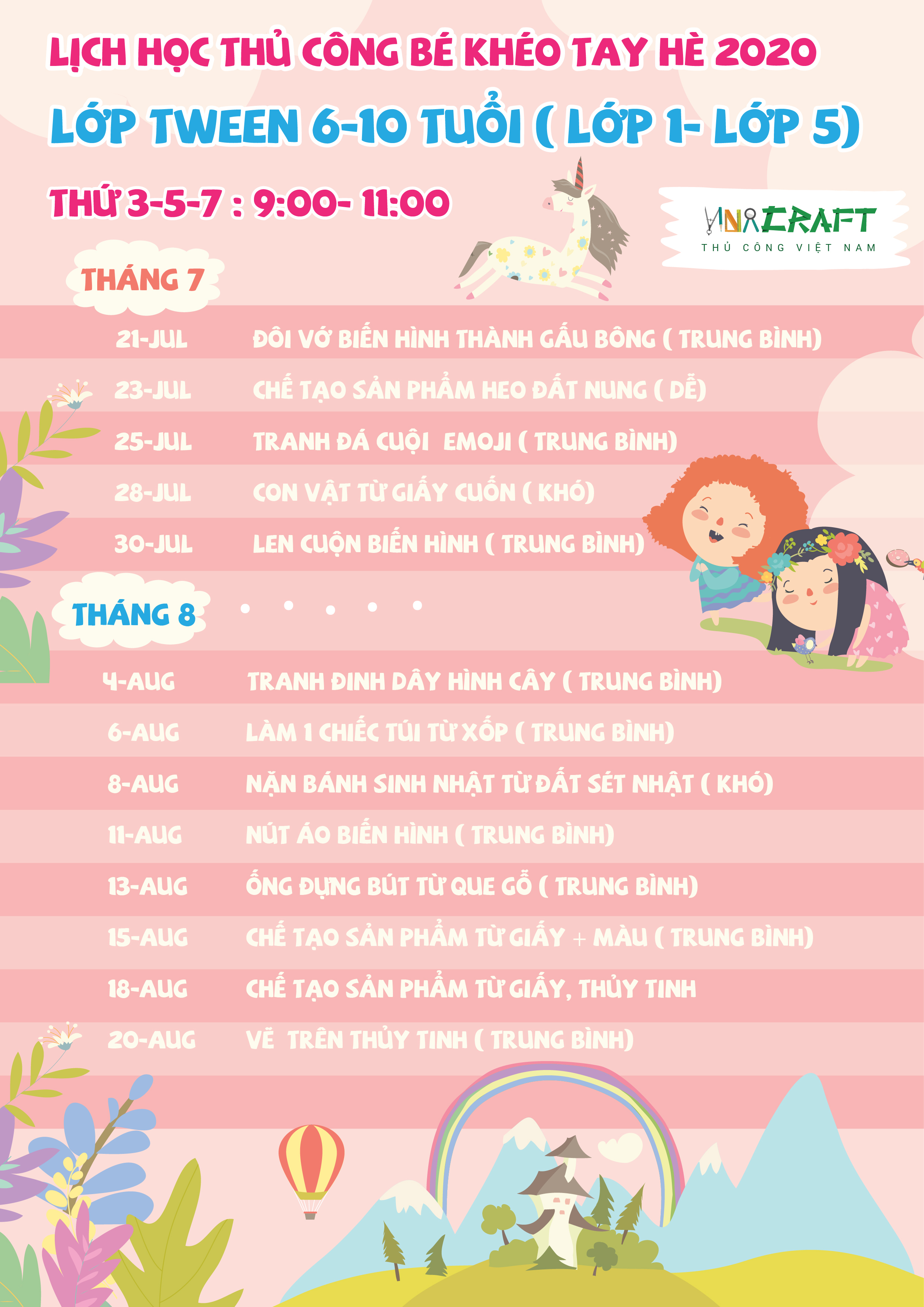 Cũng như những năm trước, lớp học sẽ chia ra 2 khối: khối Tween (6-10 tuổi) và khối Teen (11-14 tuổi), lớp học sẽ bắt đầu từ ngày 20/07/2020 - 20/08/2020 (14 buổi cho mỗi khối, gồm 13 buổi học và 1 buổi liên hoan), phụ huynh có thể đăng kí cho con em mình ngay từ hôm nay để "xí" chỗ trước nhé!