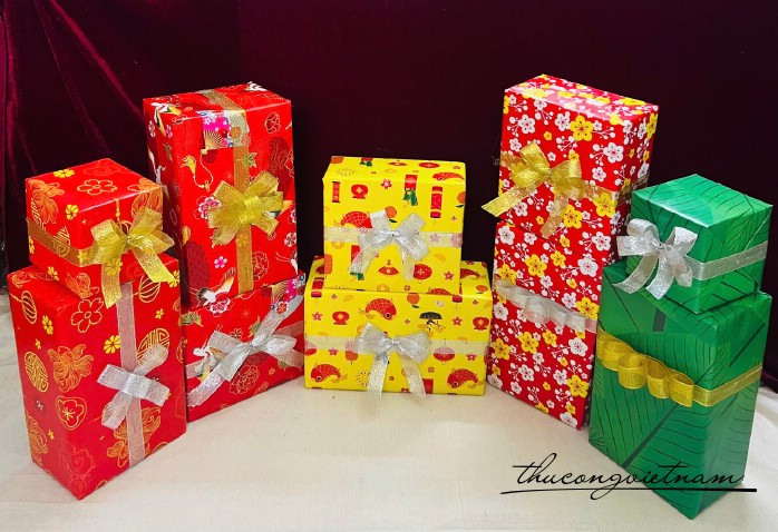 Set hộp quà cao cấp gói sẵn nhiều size được VNC gói từ những tờ giấy Tết độc đáo