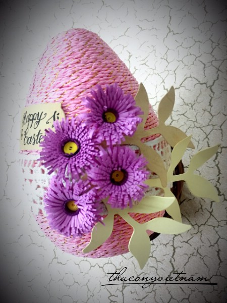 Trứng hồng được trang trí với hoa giấy, tag, ruy băng, lá